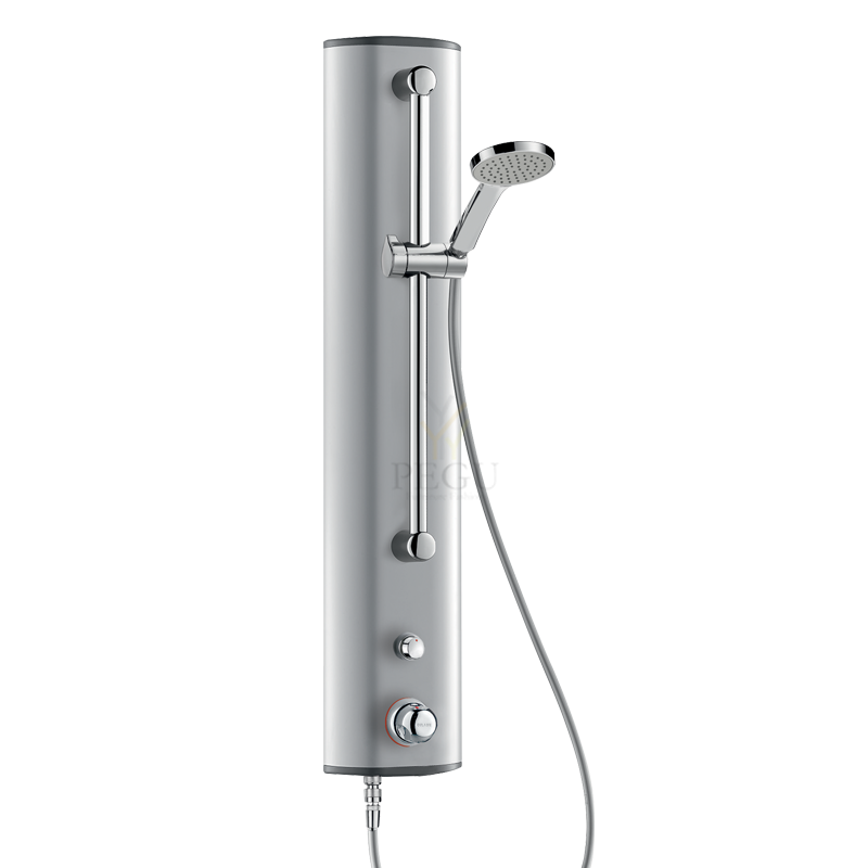 Anodised aluminium shower panel for wall-mounted, exposed installation.