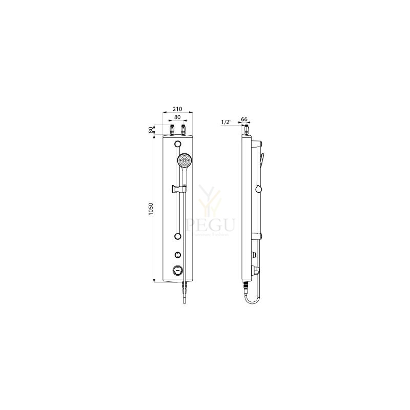 Termostaatne ajastatud vooluga dušipaneel: Anodeeritud alumiiniumist dušipaneel seinale kinnitamiseks, nähtavale paigaldusele.