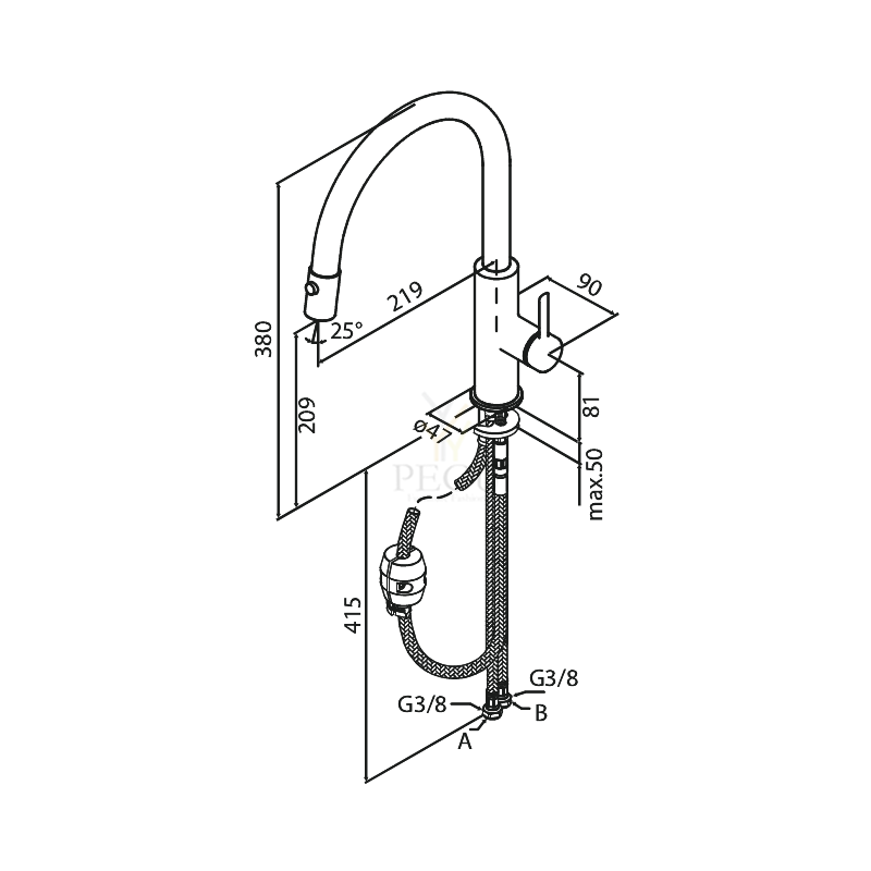 120° pöördeulatus: Piiratud pöörderaadius tagab kasutusmugavuse ja hoiab ära vee sattumise valamu taha.