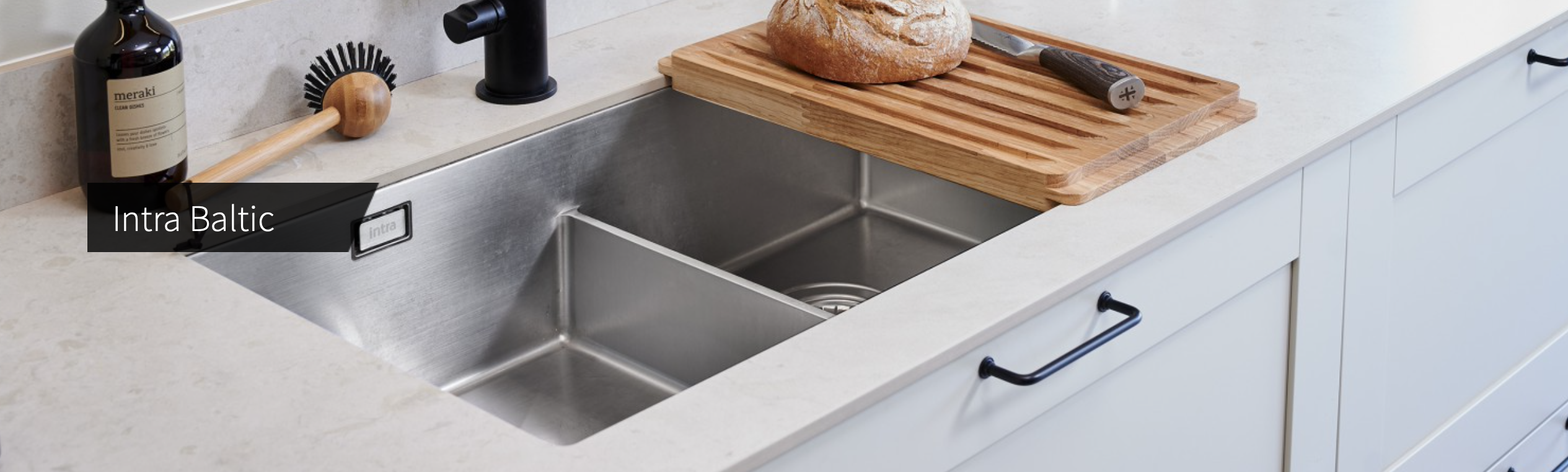Baltic square kitchen sink, 1½ bowls with thin and low divider wall, for flush and under mount. The low divider wall allows the use of either two separate bowls, or the entire sink when washing large oven trays for example.