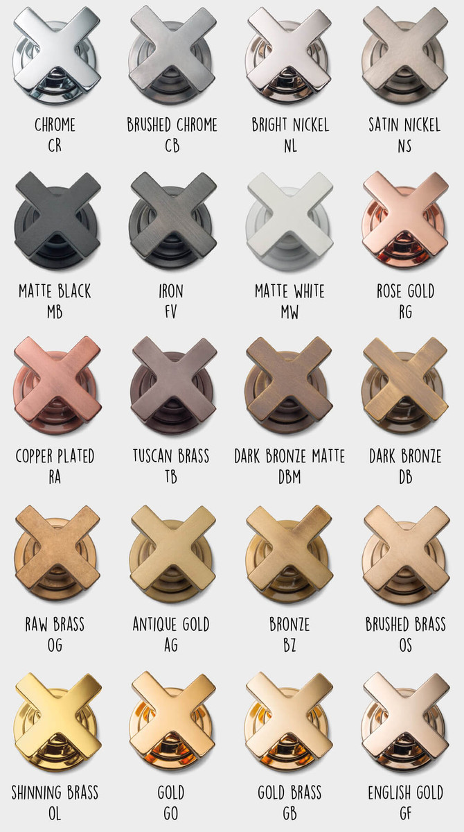 eriviimistlused – poleeritud messing, harjatud nikkel, vask, must PVD, pronks