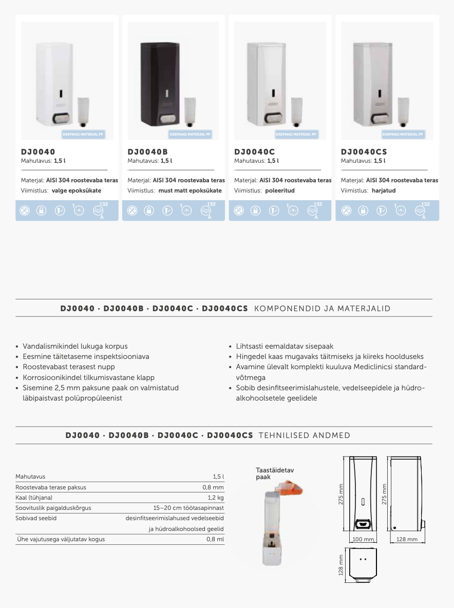Dispenses liquid soaps or hydro-alcoholic gel. Surgical soaps and soaps with solid abrasive particles are not supported.
