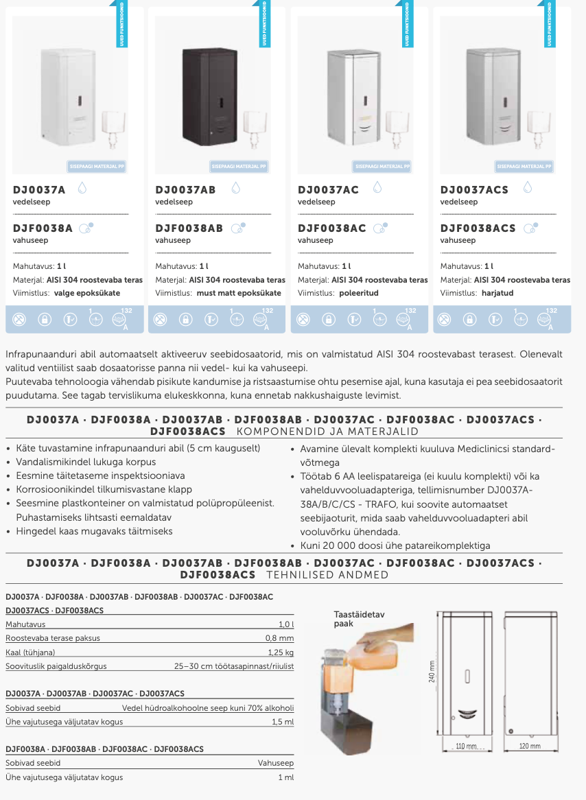 It is recommended to use liquid soaps or disinfectant gel soaps (maximum of alcohol content of 85 %) with a density between 0.9 and 1.35 kg/dm3 and a maximum viscosity of 3,000 cps.