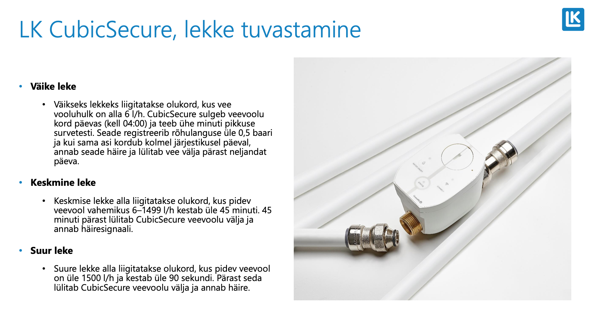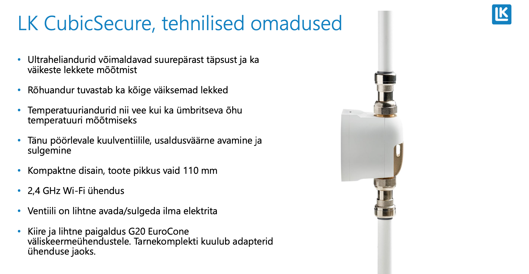 LK CubicSecure mõõdab veevoolu reaalajas ja tuvastab lekked koheselt. Veelekke valvur kaitseb teie kodu kahjustuste eest, mida põhjustavad tilgalekked ja purunenud veetorud. Tänu kompaktsele disainile on LK CubicSecure'i lihtne paigaldada ning seda saab paigaldada ka kollektorkappidesse.