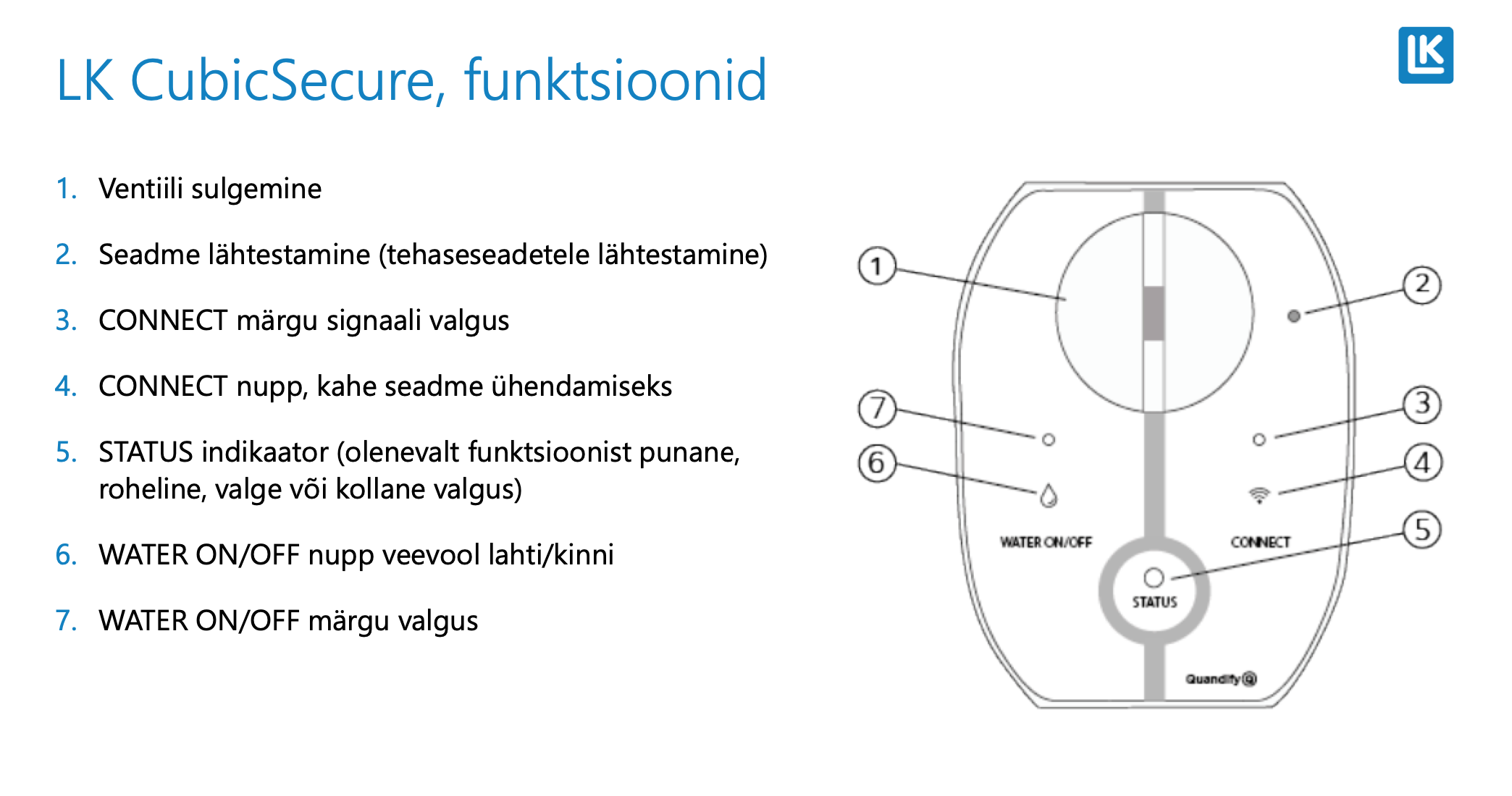 LK CubicSecure töötab täiesti iseseisvalt ega vaja Internetiühendust. Kui aga soovid mobiiltelefonile häireteateid saada ja veetarbimist jälgida, peab toode olema ühendatud Wi-Fi ühendusega. Pärast ühendamist saab LK CubicSecure'i kaugjuhtida, kasutades LK MyLK rakendust.