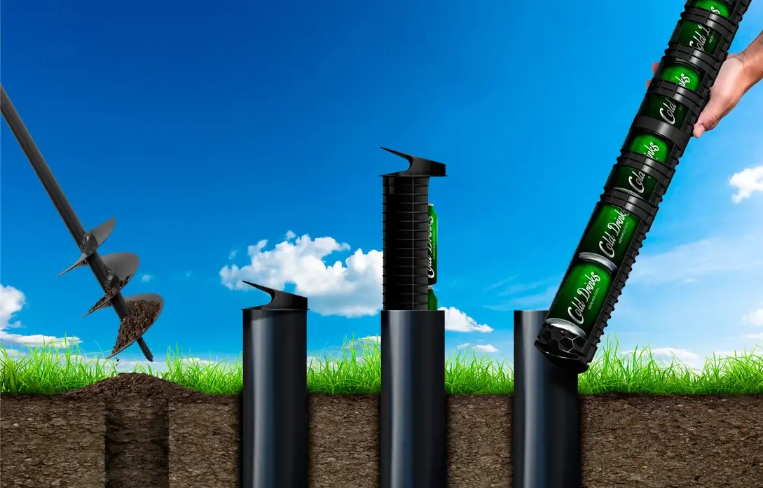 ACO DrinkCooleri külmiku saab hõlpsasti paigaldada kõikjale. Pärast umbes 1 m sügavuse ja 9 cm läbimõõduga augu puurimist maasse sisestatakse DrinkCooleri toru sellesse ja joogihoidja. Joogihoidja täidetakse joogipurkidega ülevalt.