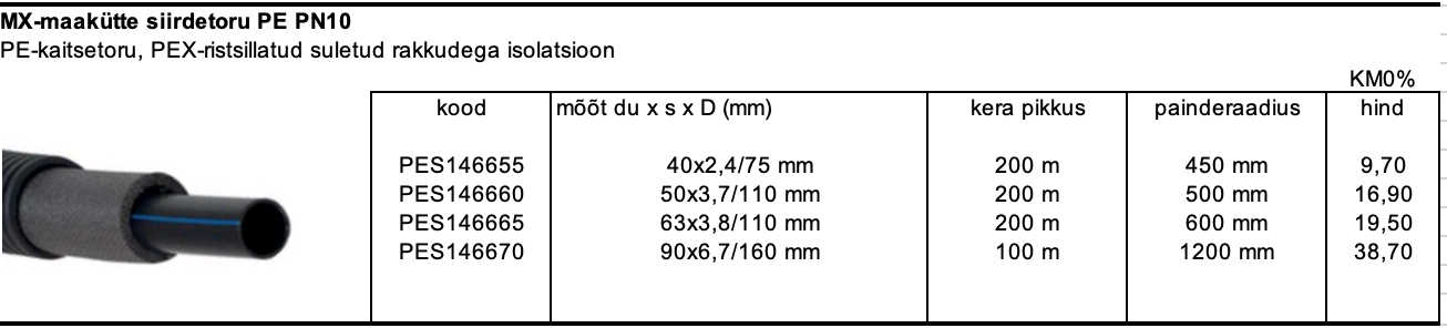 Защитная труба из полиэтилена (PE) с корругированной поверхностью MX-Arctiflex обеспечивает высокую кольцевую жесткость, но гибкую структуру. В качестве изоляции используется перекрещенный закрытый клеточный пенопласт PEX, который обеспечивает трубам хорошие теплоизоляционные характеристики (0,037 Вт/мК) и гибкую структуру. Для транспортировки жидкости используется напорный PE-трубопровод с классом давления PN10.