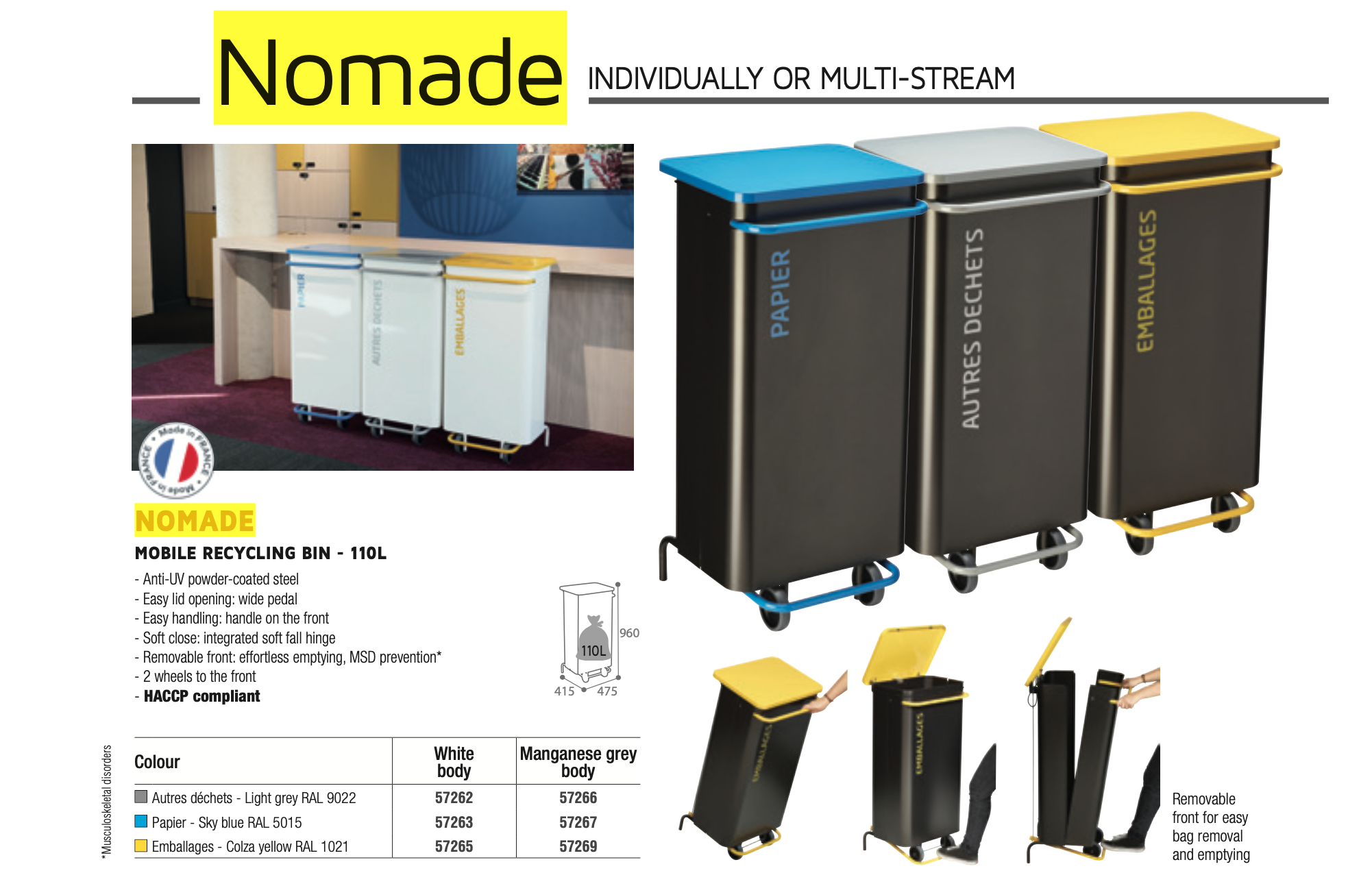 Педальная урна NOMADE 110L – это современное и удобное решение для сортировки отходов в помещениях. Производится во Франции из перерабатываемых экологичных материалов, сочетает в себе функциональность, долговечность и стильный дизайн. Прочная конструкция из стали с порошковым anti-UV покрытием гарантирует долговечность и устойчивость цвета на долгие годы.