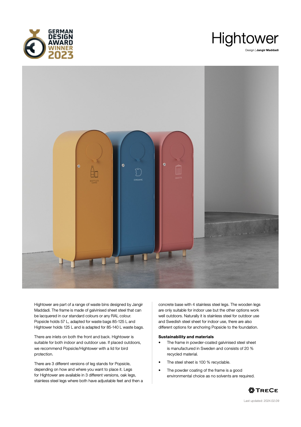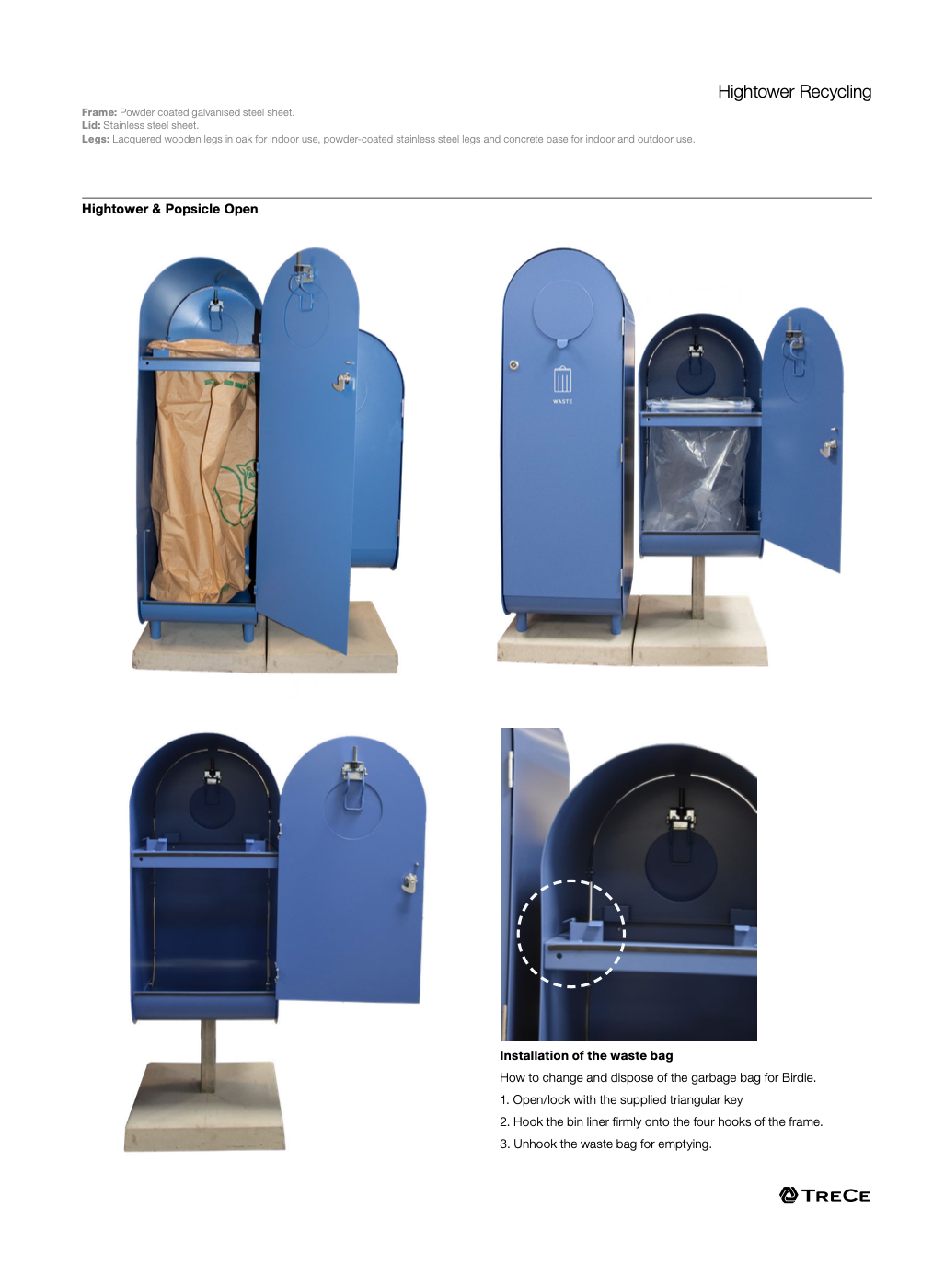 Hightower входит в серию мусорных баков, разработанных Янгиром Маддади. Рама изготовлена из оцинкованной листовой стали, которая может быть покрыта лаком в наших стандартных цветах или любом цвете по RAL. Popsicle вмещает 57 литров и адаптирован для мешков объемом от 85 до 125 литров, а Hightower вмещает 125 литров и адаптирован для мешков объемом от 85 до 140 литров.